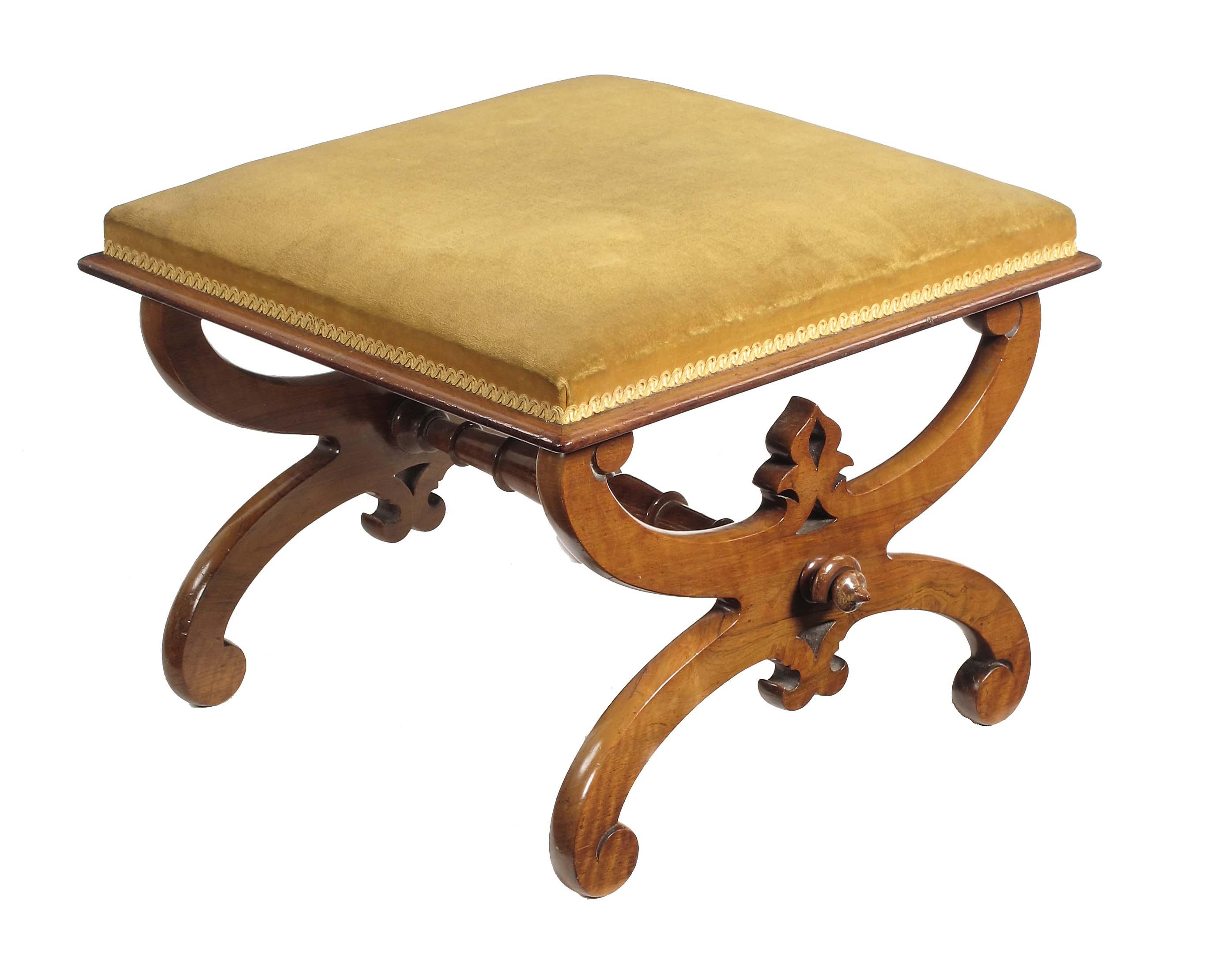 A Victorian walnut 'X' frame stool, the padded seat to pierced scroll supports united by a turned stretcher, 16.25in (41.2cm) h, 21.5in (54.5cm) w and d.