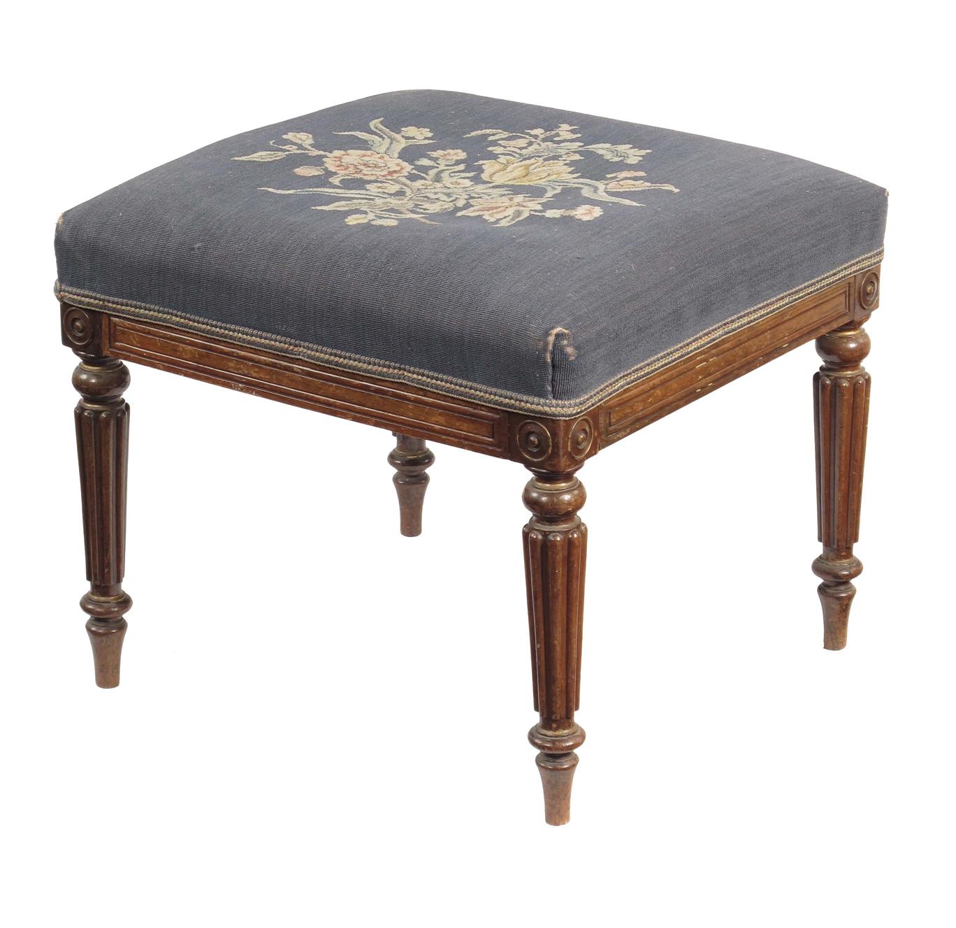An early 19th century rosewood stool, with traces of parcel gilding, the floral needlework stuffed-over seat to a moulded frieze and rondel headed reeded tapering legs, the frame inscribed in pencil 'G. Goldie', and in ink '36293', 16.5in (42cm) h, 20.25in (51.3cm) w, 19in (48.2cm) d.