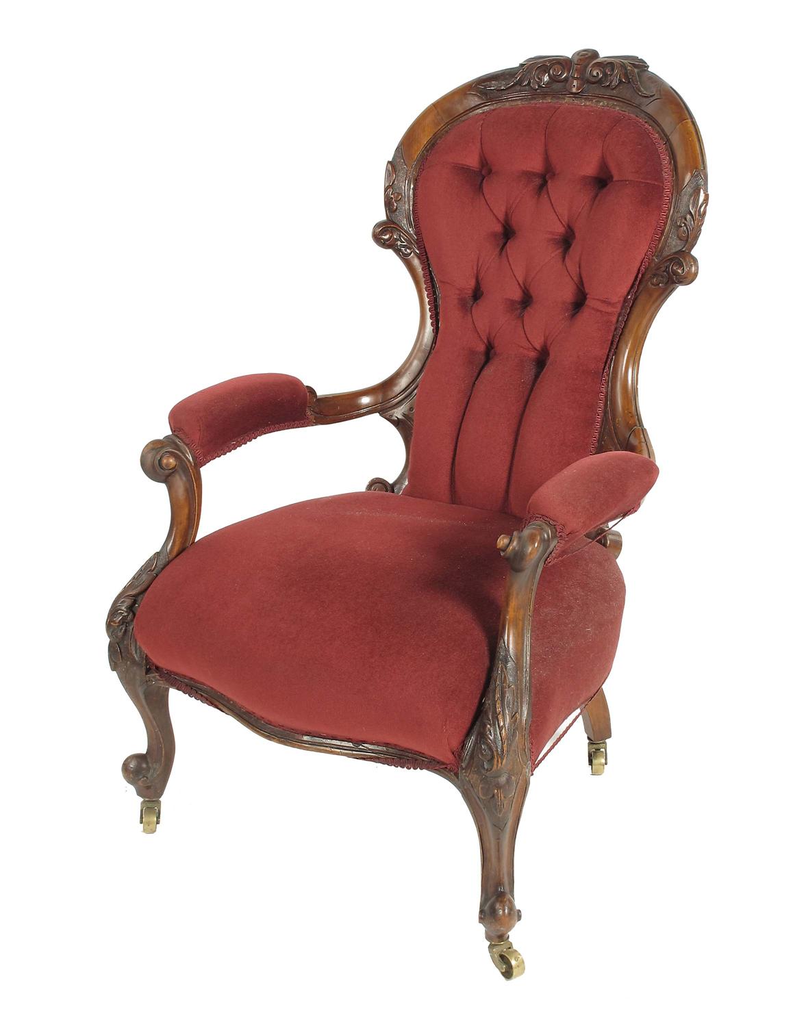 A Victorian walnut open armchair, with a button upholstered back to a leaf carved show frame on cabriole legs and later brass castors.