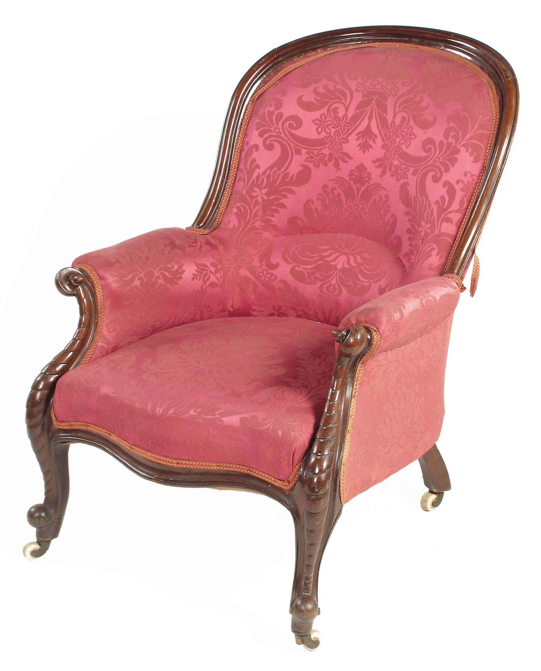 A Victorian Irish easy armchair, with a moulded frame back and a serpentine front on overlapping scale scroll supports and ceramic castors, stamped 'SAML HALL'.