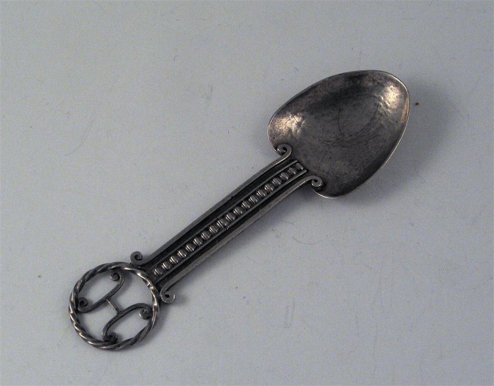 A handmade caddy spoon, with a spade bowl and rail stem, and an openwork terminal with the initial 'H', makers mark a monogramme struck once on the back of the bowl, unascribed, 1910-1930.