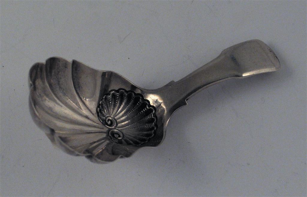 A George IV caddy spoon, with a fiddle stem and a deep fluted bowl, with a chased shell in the base, by William Knight, London, 1829.