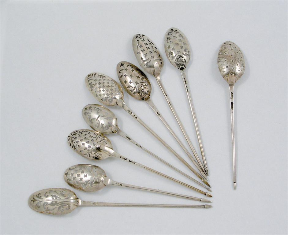 An early George II motespoon, with a single drop and pierced, symmetrical scrollwork, maker's mark only [struck twice] "HO", unascribed c.1730.