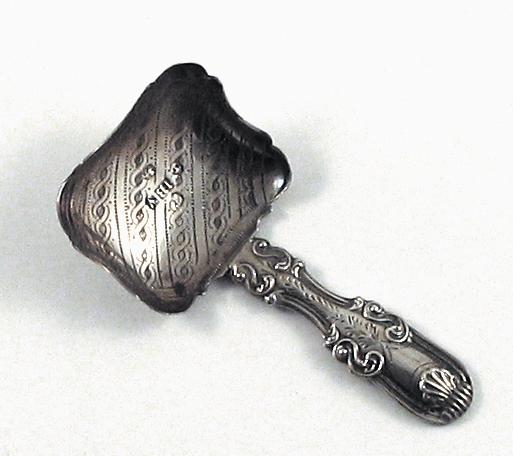 A George IV caddy spoon, with a hollow scroll decorated stem, and a shaped oblong bowl, engraved with diagonal ribbons, by John Bettridge, Birmingham, 1822.