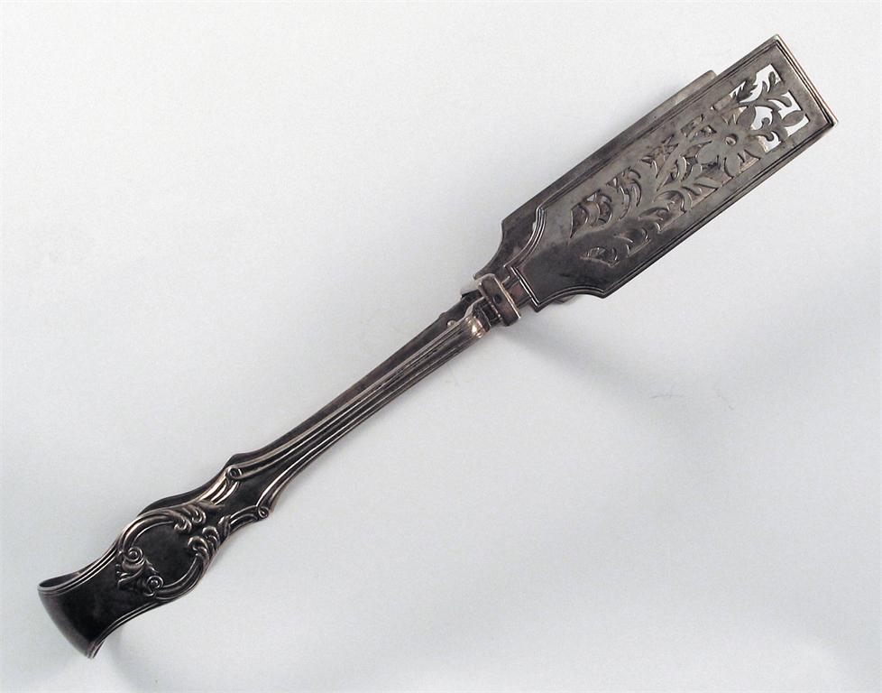 A Victorian pair of serving tongs, Vicotoria pattern with pierced blades, initial 'W', by Elizabeth Eaton, London, 1858, 6.5oz.