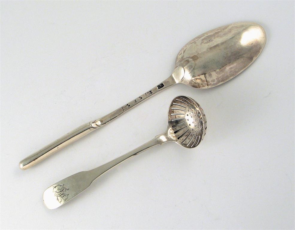 A George III Irish fiddle sugar sifter spoon, Dublin, 1804 (probably a later pierced ladle), together with a George II marrow spoon. London, 1753, 2oz.