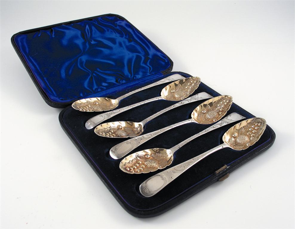Six 18th century dessert spoons, later chased and embossed as 'berry spoons', with gilded bowls, contained in a fitted case, 6oz.