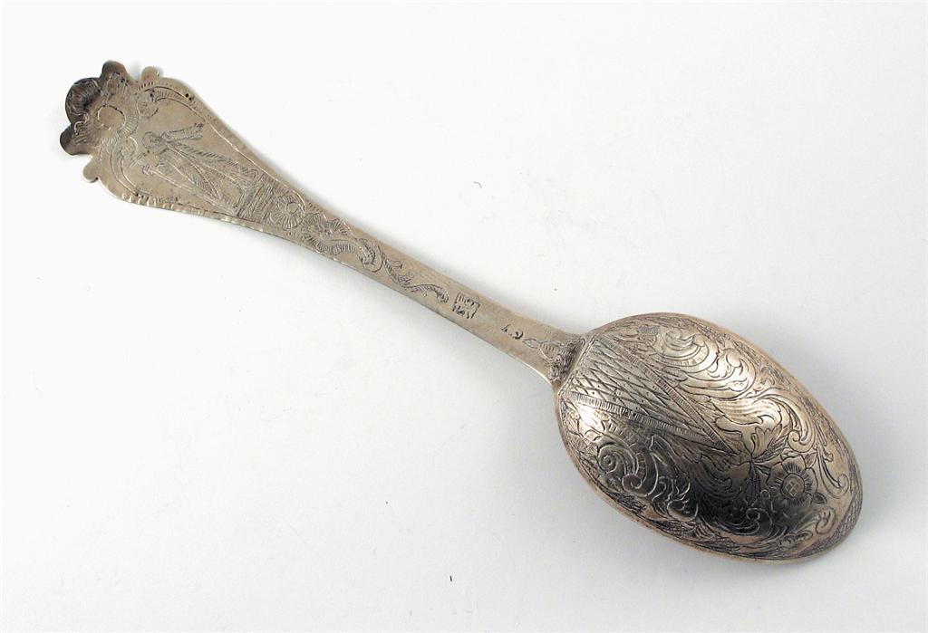 An 18th century tablespoon with a shaped terminal, decorated with chased flowers and a saint on the back of the terminal, struck with two indistinct marks, probably Scandinavian, mid 18th century 9.25in (23.5cm), 1.5oz.