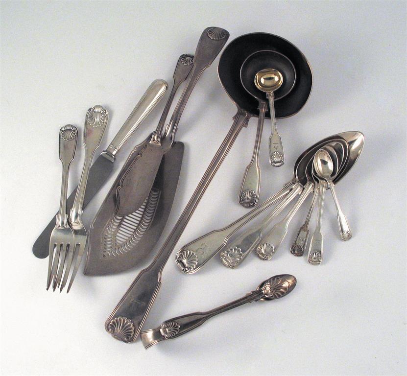 A composite or collected service, of fiddle, thread and shell pattern, (with the two different heels), comprising: 12 tablespoons 12 table forks 12 dessert spoons 12 dessert forks 12 teaspoons 12 egg spoons 12 coffee spoons 12 demi-tasse coffee spoons 2 butter knives A fish slice 2 sauce ladles A pair of tongs A soup ladle A mustard spoon 10 salt spoons Mixed makers and dates, some crested, George III to Victorian (the coffee spoons modern), together with 12 modern thread pattern table knives and 12 side knives (with stainless steel blades), 138 items in lot, 190oz weighable silver.