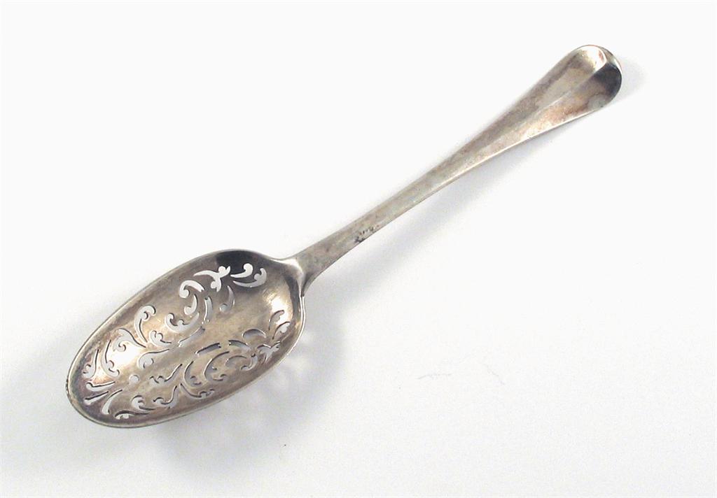 An early George II Hanoverian tablespoon, pierced with scrolls for use as a strainer, with a coat of arms on the back of the stem, by William Toone, London, circa 1725 (date letter worn), 1.75oz.