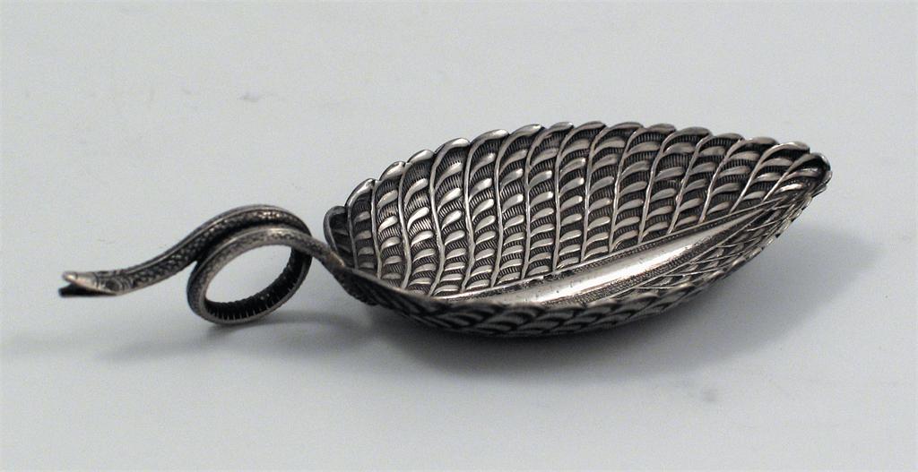 A rare George III caddy spoon, resembling a feather, the handle in the form of a coiled serpent, with textured body and open mouth, by Matthew Linwood, Birmingham, 1806.