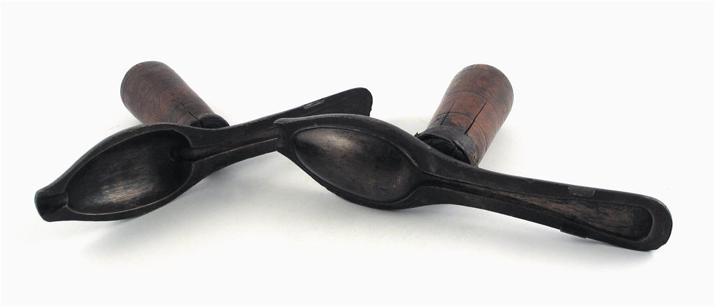 An interesting bronze, two piece mould for casting pewter spoons, with two wooden handles, probably continental, late 18th/early 19th century, 9.25in (13.5cm) wide overall.