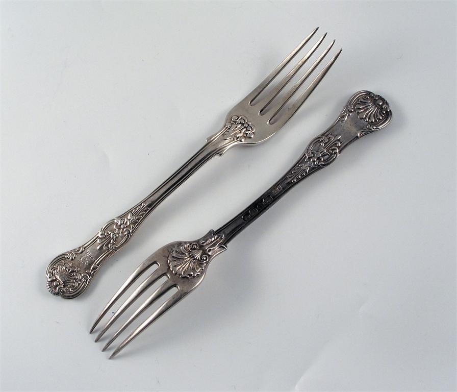 Queens pattern dessert forks: A set of six single struck, initialled 'H C', by George Adams, London, 1857 and a set of six George IV examples, crested, by Morris and Michael Emanuel, London, 1827, 22oz, (12).