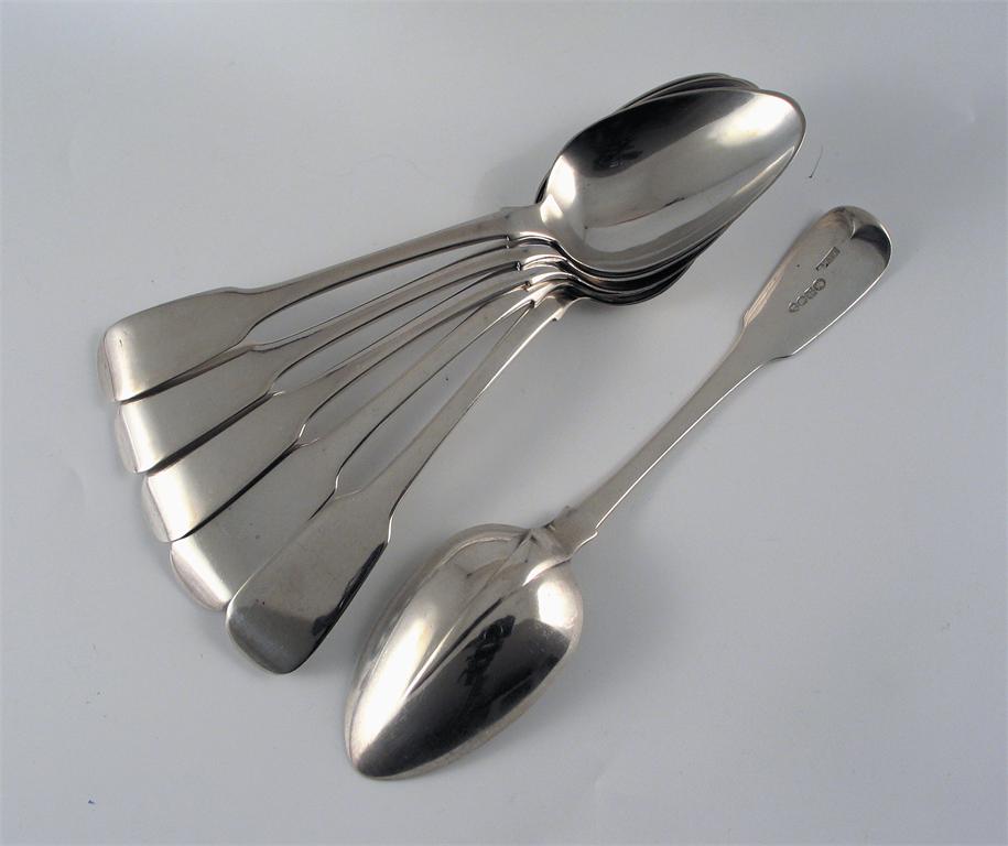 A set of six George IV Irish fiddle rattail dessert spoons, by Edward Twycross, Dublin, 1826, 6oz, (6).