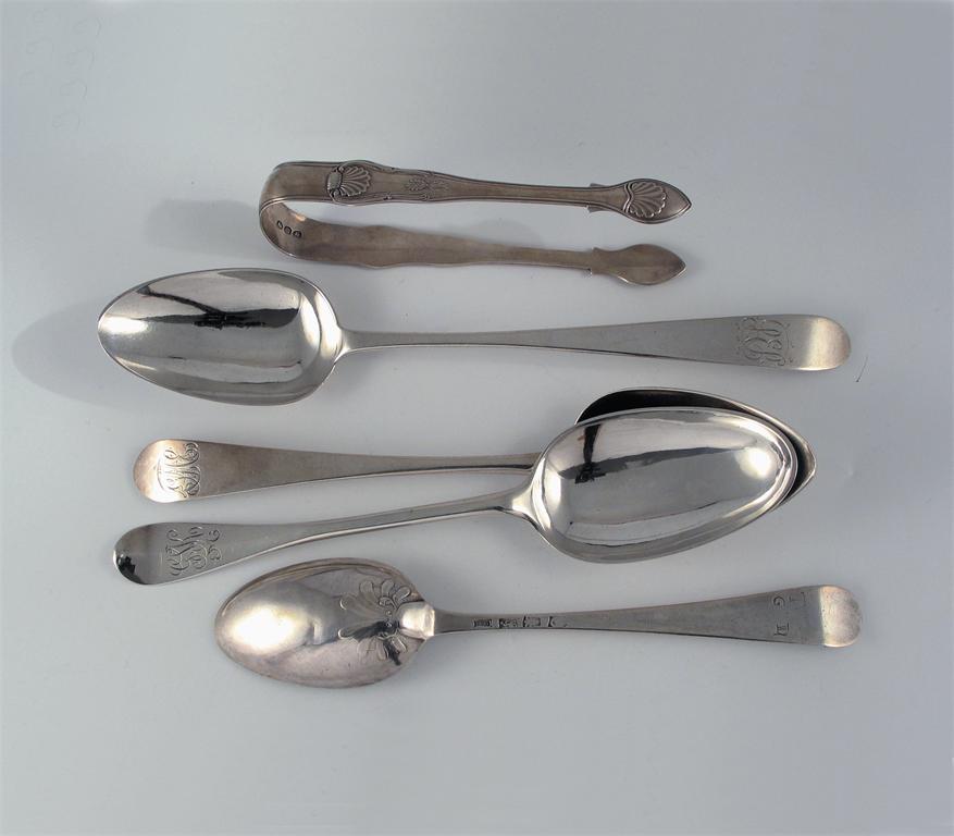 A mixed lot: comprising one Irish and two Scottish tablespoons; a George III fancy back tablespoon and a pair of Kings, variant sugar tongs by William Bateman, London, 1818, 9oz, (5).