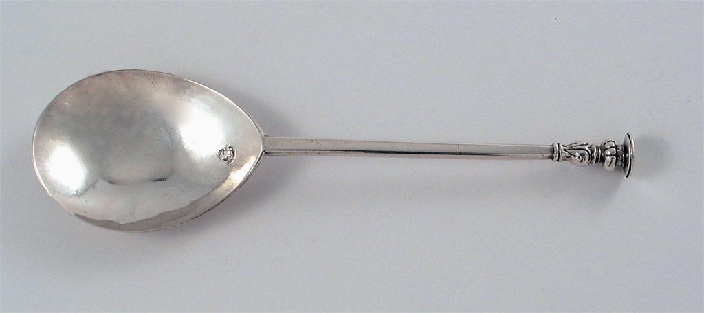 A James I tentatively ascribed West Country seal topspoon, the terminal, chaise and fluted and pricked with indistinct initials, the slender stem with a 'V' rattail, by an unknown maker, possibly Trwo, c.1620, 604in (16.2cm) long, 1oz.
