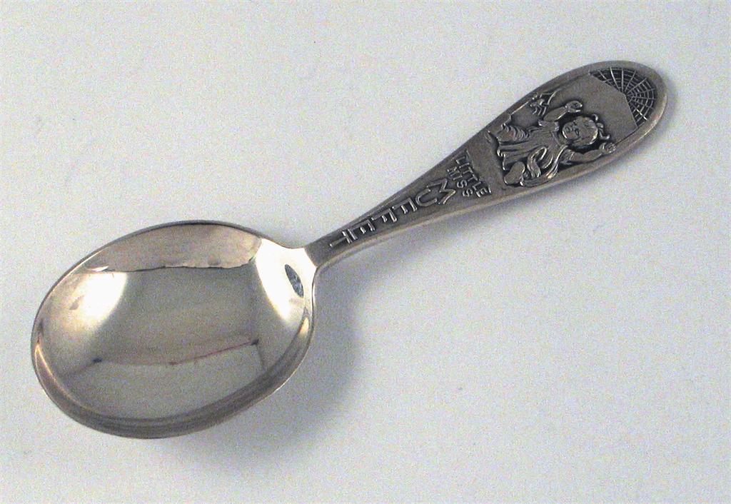 A modern Nursery Rhyme caddy spoon, decorated up the stem with Little Miss Muffett and a spider, Birmingham,1935.