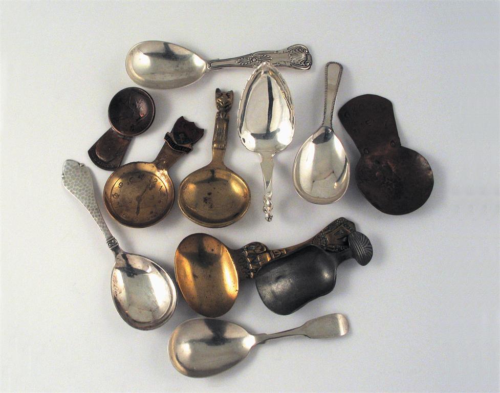 Assorted caddy spoons including: A Kings pattern example, by Henry Holland, London, 1870; a modern feather - edge spoon; a Victorian fiddle caddy spoon; a Scandinavian caddy spoon; a Scandinavian leaf bowl spoon; two copper spoons; three brass spoons and a pewter caddy scoop, (11).