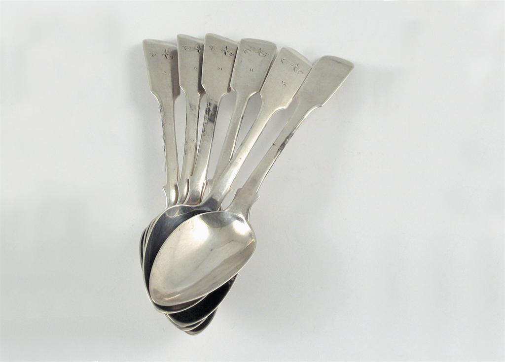 Six Scottish provincial teaspoons, by Alexander Cameron, Dundee, five with Edinburgh hallmarks for 1844 (numbered 7,9,10,11,12 and initialled 'A'), and one circa 1830, 3.5oz, (6).