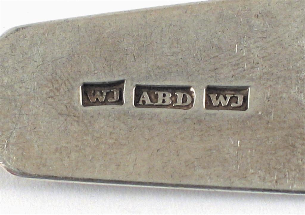 A set of seven George III/IV Scottish provincial fiddle teaspoons, crested, by William Jamieson, Aberdeen (WJ, ABD, WJ), 1815-1825.