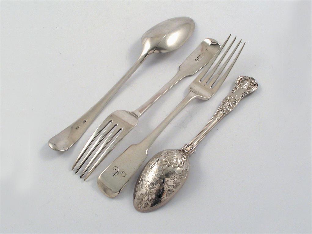 A mixed lot: A 19th century unascribed tablespoon, initialled, maker's mark "HW" [twice], a pair of Scottish tableforks, initialled, by John Ziegler, Edinburgh 1813 and a Queens pattern dessert spoon, by R. Martin & E. Hall, Sheffield 1866, 8oz. (4)