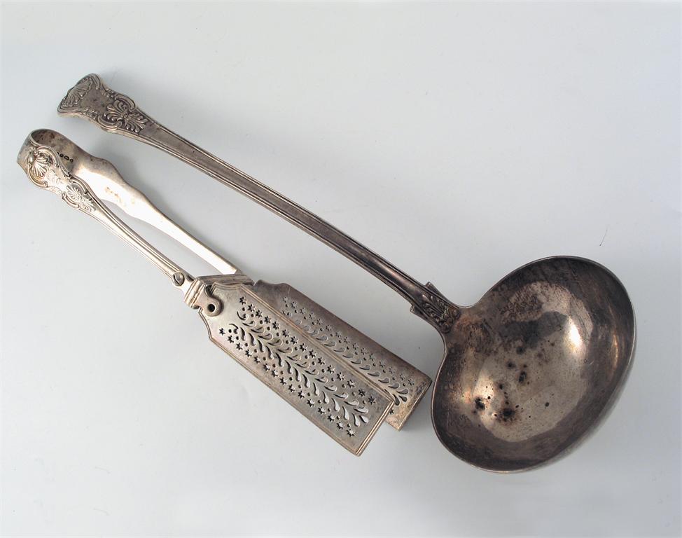 A Victorian Kings honeysuckle pattern soup ladle, crested, by Charles Lias, London 1837 together with a pair of matching serving tongs, crested, by George Adams, London 1851. 18oz. (2)