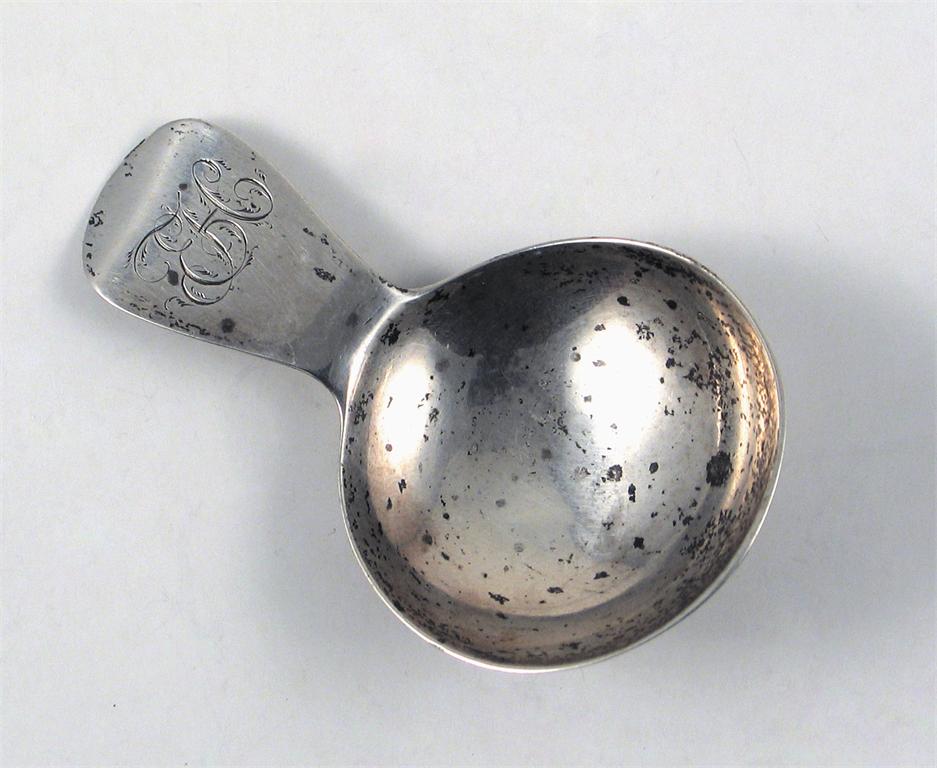 A George III Irish caddy spoon, with a plain circular bowl, initialled 'E.H.' by Michael Keating, Dublin c.1800 (no date letter).