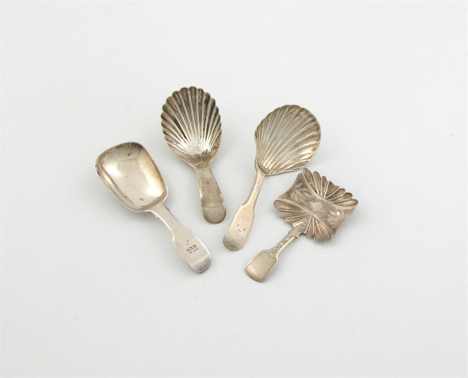 A collection of four antique silver caddy spoons, comprising: one by Josiah Snatt, London 1802, with a fluted bowl, one with a square bowl, Birmingham 1830, plus two Fiddle pattern examples, London 1817 and 1828. (4)