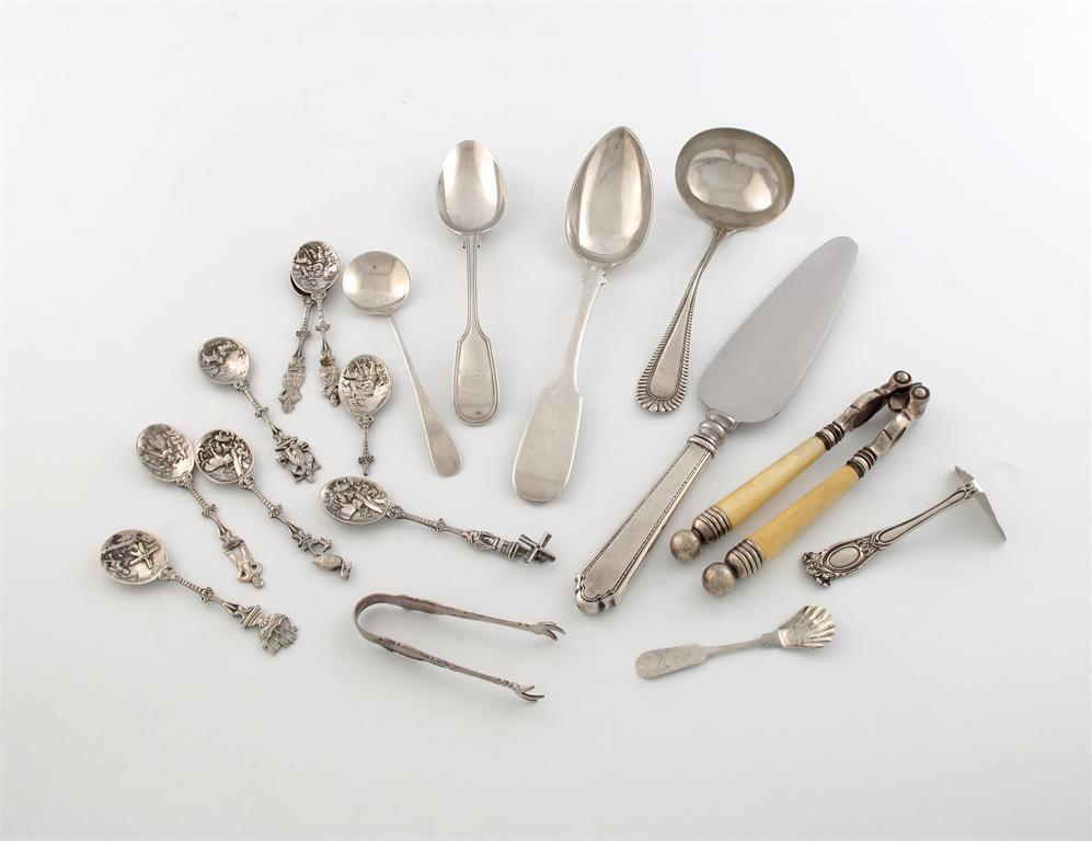 comprising: a 19th century Russian fiddle pattern tablespoon, 1859, an American fluted sauce ladle, a spoon, a pair of sugar tongs, an American silver-handled cake slice, a baby pusher, a salt spoon, seven continental spoons, and a plated spoon and a pair of nut crackers, approx. weighable 8oz. (qty)