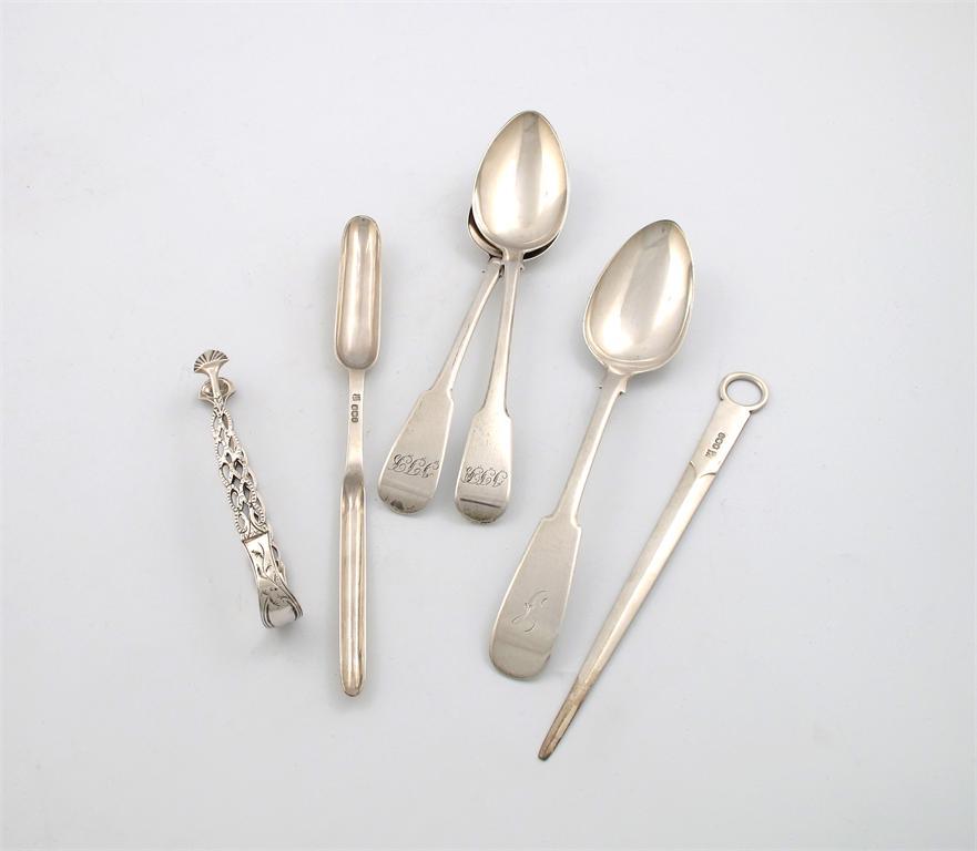 comprising: a modern silver marrow scoop and meat skewer, by The Cooper Brothers, Sheffield 1972 and 74, a Newcastle tablespoon, two further tablespoons and a pair of 18th century cast sugar tongs, with pierced decoration and shell bowls, approx. weight 10oz. (6)