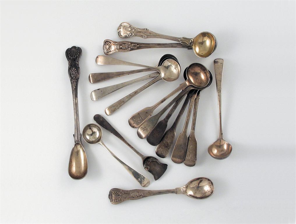 Eighteen assorted condiment spoons, mixed makers, dates and designs.