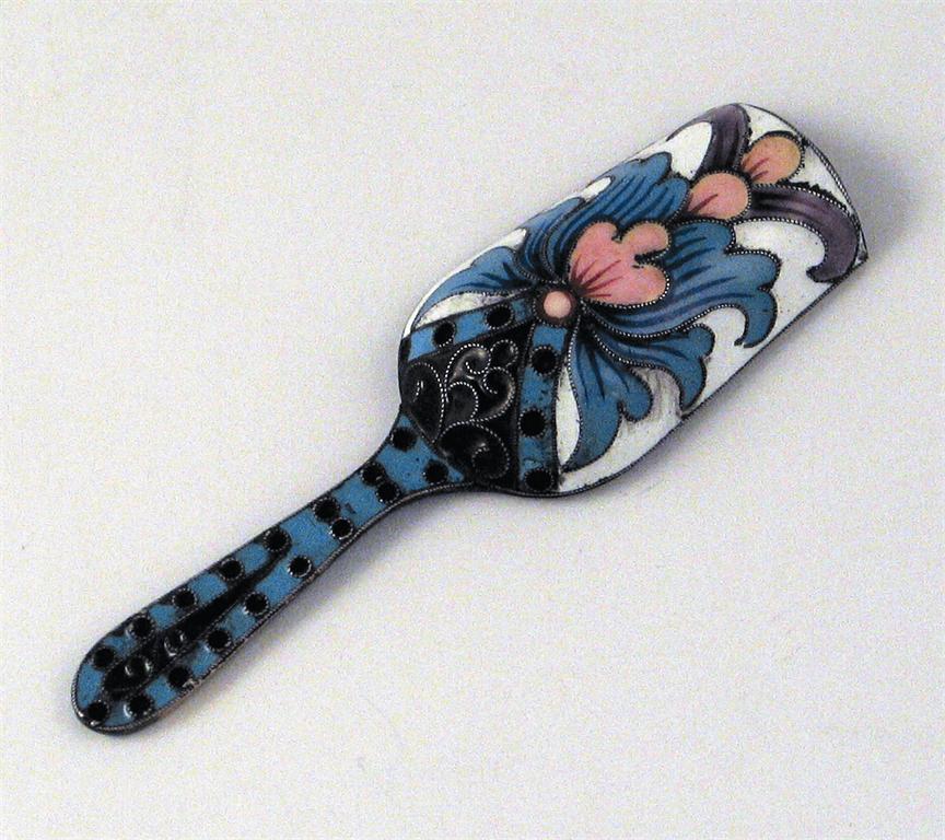 A 20th Century Russian cloisonne enamel caddy spoon, with a shovel bowl, decorated in pastel shades with pellets and foliage, with Soviet marks.