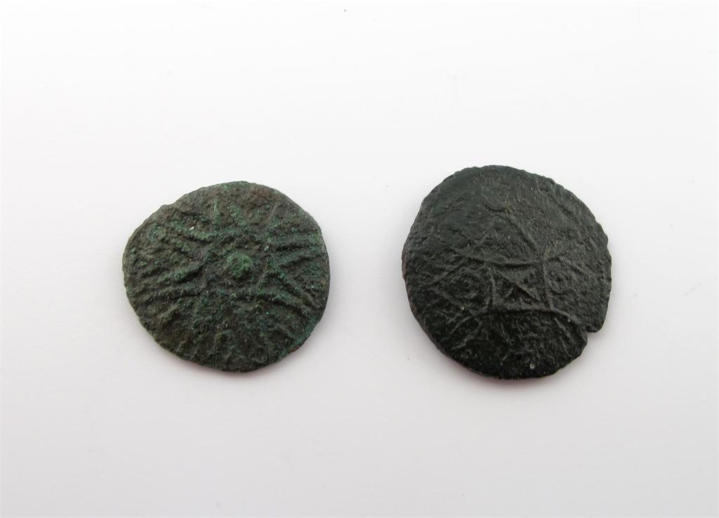 A Celtic Bronze Units, Trinovantes & Catuvellauni, Tasciovanus, 3rd coinage, 15-10 BC, geometric pattern, pellet in centre, rev bull left, 2gms; another very similar, X in centre, horse to left, 1.9gms (Van Arsdell 1808-1, 1812-1; S 247, 249). Both fine, greenish patina to first.