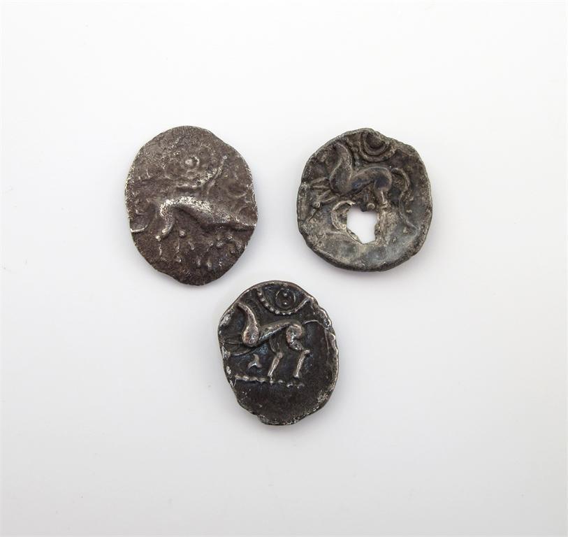 Three Celtic Silver Units, Corieltauvi, Hostidius type, 55-45 BC, uninscribed, boar right, rev Celticized horse left, each 1.2gms (Van Arsdell 855; S 396).