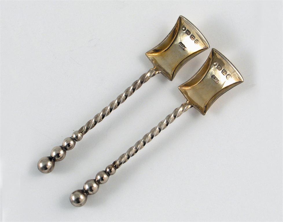 A pair of Victorian small salt shovels, with twisted stems and graduated ball finials, by Hilliard and Thomason, Birmingham, 1886, (2).