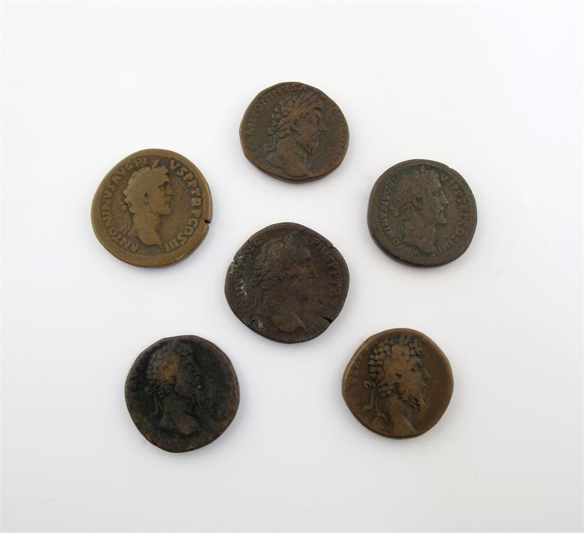 Roman, Antoninus Pius (AD 138-161), bronze Sestertii, Rome mint, c AD 141-143, laureate head right, rev River God Tiber reclining (S 1272), quite rubbed, fair to fine; others (2), both revs Mars with lance; with other coins, generally fair to fine. (6)