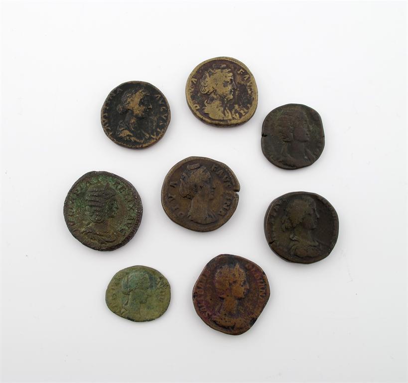 Roman, Faustina Snr, wife of Antoninus Pius, bronze Sestertii (2), Rome, posthumous issue, draped bust right, rev Aeternitas standing; other Sestertii (5), including Julia Domna, and smaller (1), all female portraits. Generally fine or nearly so. (8)