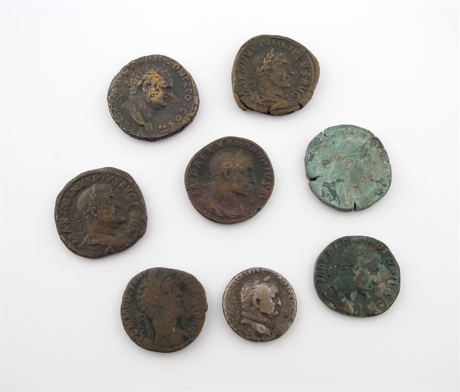 Roman bronze coinage (8), Sestertii (7), and a late Ptolomaic base Tetradrachm. Generally fair, perhaps a little better, one with green patina. (8)
