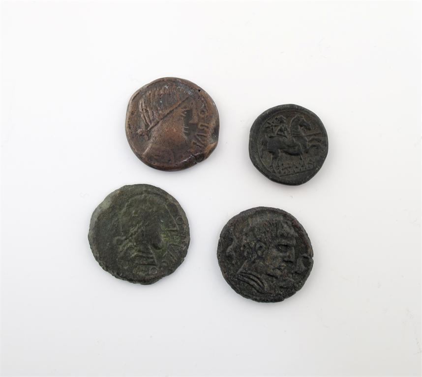 Spain, Celtic imitations of Ancient bronze coins (4), 'Roman' (2), head right rev ear of wheat and 'legend' in two lines (2), fair and fine; 'Greek' (2), Castulo type, head right, rev horseman to right (2 - one of crude style), fine and very fine. (4)