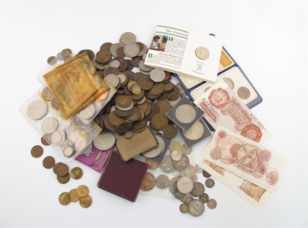 Miscellaneous coins, including several Crowns, 1951 and later; 10/- notes, L. K. O'Brien (8), in sequence; Victoria, copper Farthings (8). Varied state. (lot)
