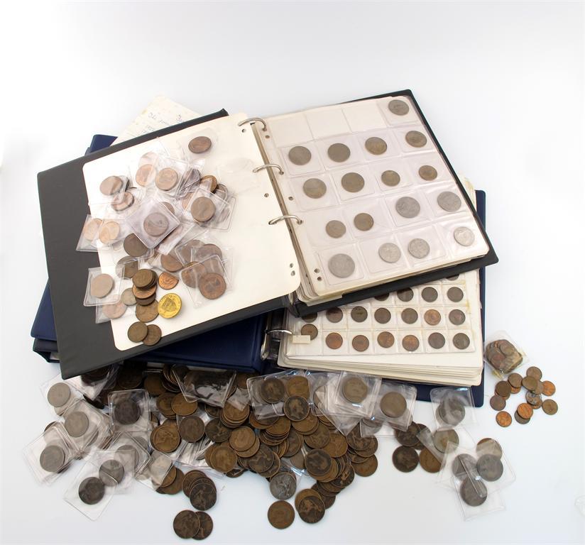 Silver Crowns (9), Victoria and George III (1); with quantities of modern coinage, in three albums; with others loose, mostly bronze pennies, etc. Varied state, the silver fair to fine. (lot).