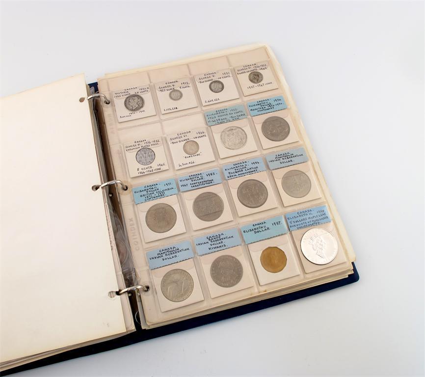 A collector's coin album with, Mexico, miniature gold coin-like medallets (2), 8-Reales, 1884 and other silver (6); Canada, Maple Leaf silver 1 oz 5-Dollars, 1990, Dollars (3); Maria Theresia Thalers (2); sundry others, including other silver; British War Medals, 1914-18 (2), named without ranks or titles. Varied state. (lot)