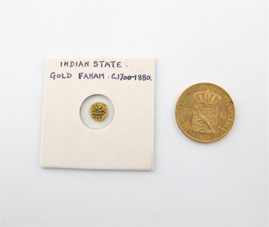 Netherlands, William III, 10-Guilders, 1875; with an Indian Native States, gold Fanam. Very fine. (2)