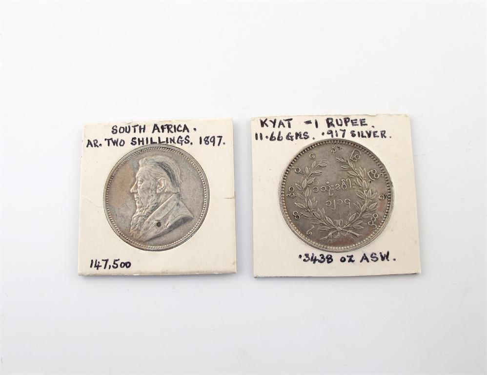 Burma, Peacock Rupee, 1852; Z.A.R., Kruger, Halfcrown, 1897. Very fine. (2)