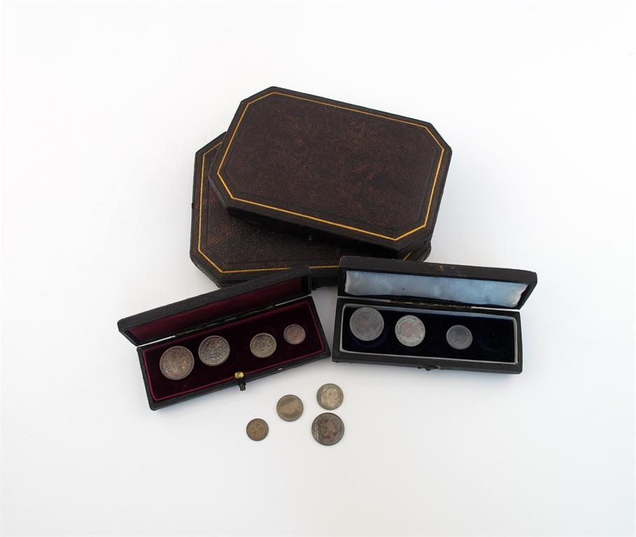 Victoria, Maundy Set, 1900 (lacks Penny); Edward VII, Maundy Set, 1902, both in rectangular fitted leather cases; Threepence, 1887; Twopence and Penny, 1891; Twopence, 1907; with fitted velvet-lined leather cases (2), for seven and eight coins respectively. Coins extremely fine. (lot)