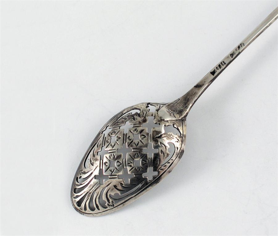 A George II mote spoon, with pierced crosslets and scroll, heightened by engraving, a single drop, initialled 'C' over 'I H' and a long stem with a diamond stem, makers mark only struck twice, possibly by William Woodward, London, circa 1745.