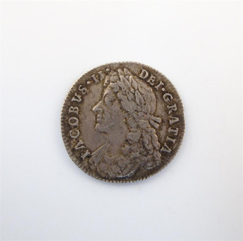 James II, Shilling, 1686, laureate bust left, rev cruciform shields (ESC 1070; S 3410), laureate bust left, rev cruciform shields (ESC 498; S 3408. Very fine.