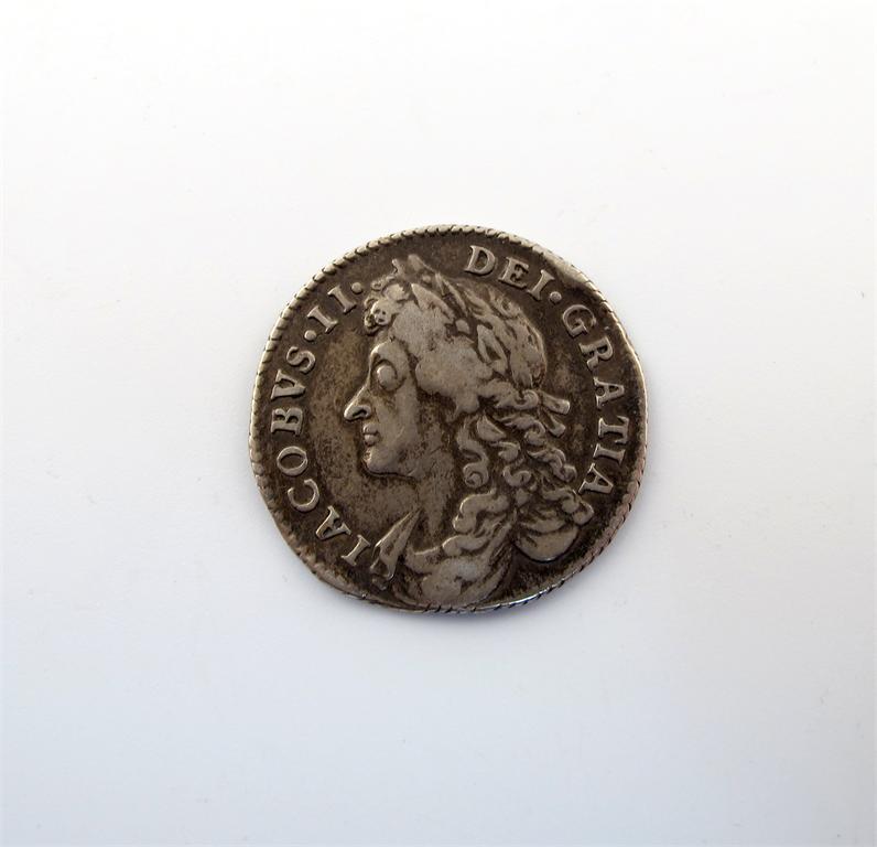 James II, Sixpence, 1687/6, laureate bust left, rev early shields (ESC 1525; S 3412), laureate bust left, rev cruciform shields (ESC 498; S 3408. A little creased, good fine.