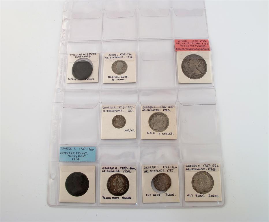 Anne, Pre-Union Halfcrown, 1707, roses and plumes (S 3582); smaller silver, Anne, George I (2), George II (4); copper (2). Fair and fine. (10)