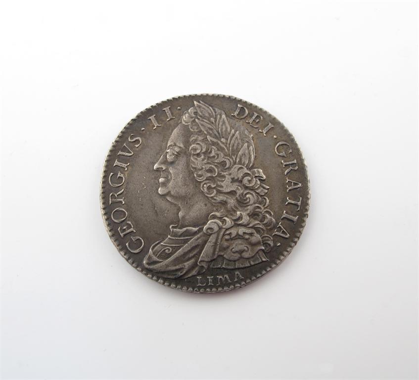 George II, Halfcrown,1746 LIMA, old head, edge D. NONO, laureate bust left, rev cruciform shields (S 3695A). Very fine, toned.